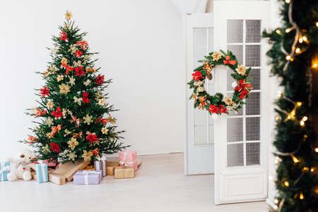 Christmas and New Year interior in light classic style. White room with Xmas Tree decorated, flashing garland, golden balls. Bright New Year celebration décor. Winter Holiday Background