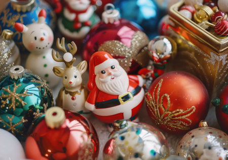 Christmas ornaments, Santa figurines, festive decorations, colorful baubles on a background of shimmering lights A joyful arrangement full of holiday spirit