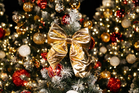 Golden bow decorating artificial christmas tree lights