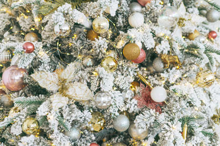 Golden & Silver color of christmas ball on the branches fir with beautiful light bokeh, Decorated Christmas tree. New Year Decoration festive background with vintage tone and selective focus.
