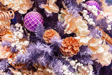 Close-up of a ball and cones and other decorations on a Christmas tree. Christmas celebration.