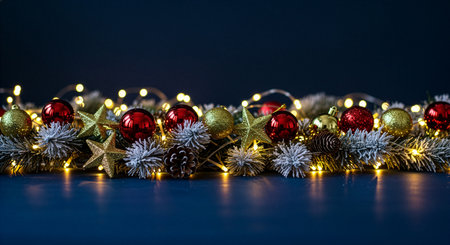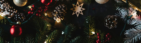 Christmas decorations on a dark background with bokeh. Christmas background