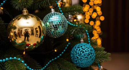 A festive Christmas tree adorned with shiny ornaments and twinkling lights, creating a warm and inviting holiday atmosphere.