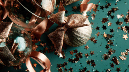 Close-up of a rose gold ribbon tied in a bow, scattered with star-shaped confetti on a teal surface.