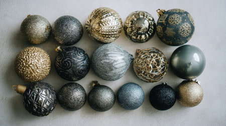 An exquisite collection of gold and black Christmas ornaments perfectly arranged, showcasing intricate designs and textures for a stunning holiday display or promotional use.