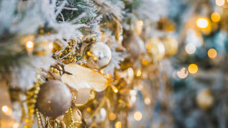 Decorated Christmas tree in golden and white toys with lights bokeh textured background