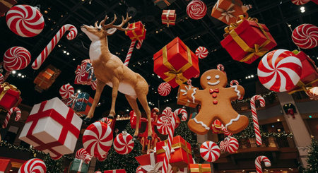 Christmas and New Year decorations in the form of a reindeer, gingerbread man, candy canes and lollipops.