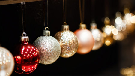 Charming Row of Christmas Baubles Against Black Background: Varied Colors and Finishes Illuminated by Soft Out-of-Focus Lights