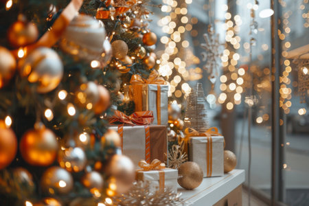 Wrapped presents adorned with golden ribbons and baubles create a cozy holiday atmosphere in a vibrant shop display, illuminated by soft lights that enhance the seasonal cheer and magic.