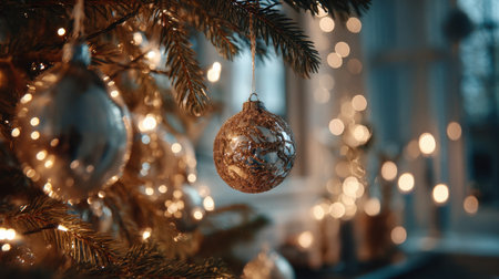 This enchanting image features a detailed Christmas tree ornament that sparkles amidst a backdrop of soft bokeh lights, evoking a cozy and joyful holiday spirit.