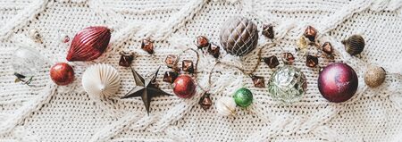 Christmas or New Year holiday background, texture, wallpaper. Flat-lay of Christmas festive decoration toys and balls over white knitted woolen background, top view, wide composition