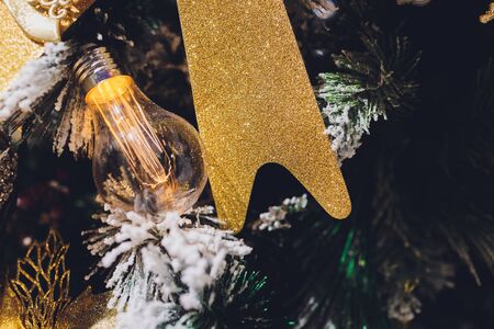 Christmas tree with shiny decorations. Fir tree decorated with light bulbs and star for New Year celebration.