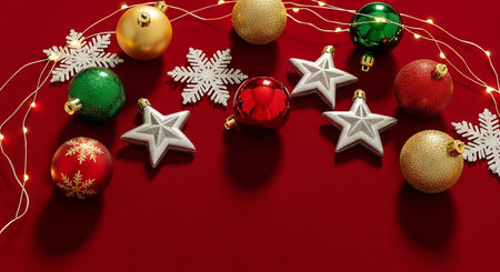 Christmas decoration on red background. Top view with copy space. Flat lay.
