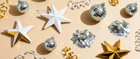Shiny disco balls, white and gold stars, metallic ribbons, and sequins arranged on a neutral background for festive celebration.