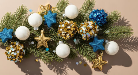 Festive christmas evergreen garland with white baubles blue and gold star ornaments and sparkling sequins on neutral background.