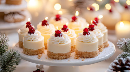 A beautifully arranged display of mini cheesecakes topped with red berries and cinnamon sticks. Perfect for festive celebrations and gatherings.