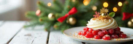 A festive dessert featuring whipped cream and berries garnished with a decorative element. set against a blurred background with christmas lights and evergreen branches adorned with ornaments, creating a cozy holiday ambiance.