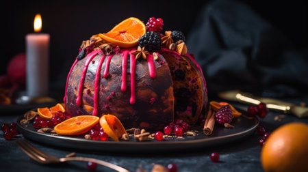 fruit cake with nuts and berries and sweet syrup in dark generative ai.