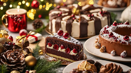 A close-up of festive Christmas cakes decorated with chocolate, fruit, and powdered sugar, surrounded by ornaments and holiday decorations, creating a joyful and sweet holiday atmosphere.