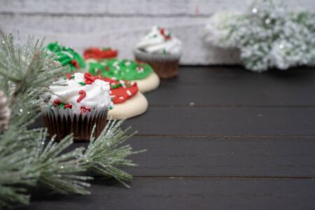 Christmas holiday dessert background banner with glittery pine branches, cupcakes and cookies. Selective focus on vanilla cupcake
