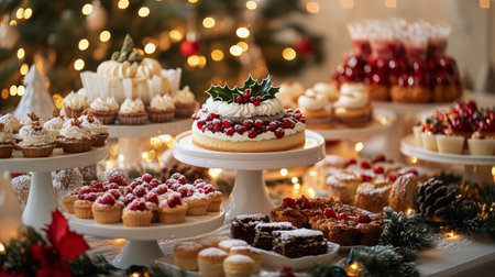 Christmas dessert table adorned with various cakes, cookies, and candies, creating a festive and indulgent atmosphere.High resolution AI generated