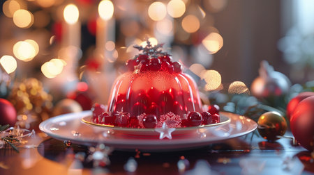 A glistening red jelly dessert centerpiece, adorned with fresh berries and festive sprinkles, set against a backdrop of warm Christmas lights and decorations.