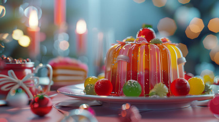 A colorful, translucent jelly dessert adorned with festive sprinkles and small candy balls, set against a backdrop of soft, glowing Christmas lights.