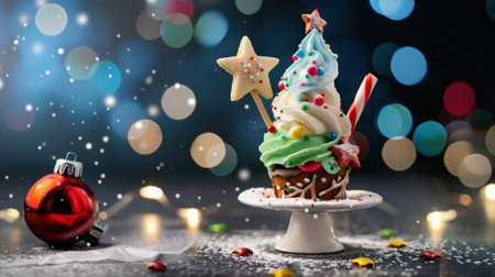 A delightful cupcake featuring vibrant colors, topped with creamy frosting and festive decorations, set against a sparkling winter background.