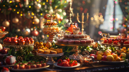 Decorated with festive ornaments, a bountiful dessert table showcases an array of holiday treats