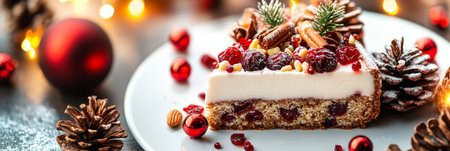 Holiday Fruitcake Slice With Festive Decorations And Twinkle Lights. Christmas Food Concept.