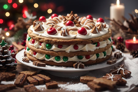 A delicious festive Christmas cake decorated with red berries, gingerbread stars, and holiday decorations, surrounded by pine branches and ornaments, creating a cozy holiday atmosphere.