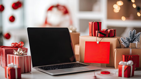 A modern laptop and smartphone are set up for online shopping, surrounded by gift boxes and festive lights, symbolizing holiday e-commerce.