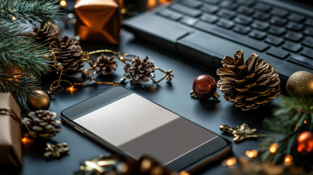A smartphone with a blank screen sits amidst festive holiday decorations including wrapped gifts, ornaments, and evergreen boughs. The scene is illuminated by soft overhead lighting, presenting a warm and inviting atmosphere. Suitable for use in advertising, promotional material, or holiday-themed commercial applications.