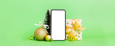 Christmas online shopping from home phone with blank white display top view. smart mobile with copy space on colored background with Christmas decorations balls,. Winter holidays sales background.