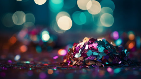 Softly blurred colorful bokeh lights float above a surface covered in a vibrant mix of scattered confetti, creating a festive and celebratory mood.