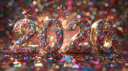 3D metallic 2026 numbers illuminated by fireworks and surrounded by colorful confetti, sparkling and festive atmosphere