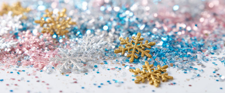 Bright and colorful glitter in shades of blue, pink, and silver scattered across a white surface with snowflake decorations. This vibrant display captures the essence of winter festivities.