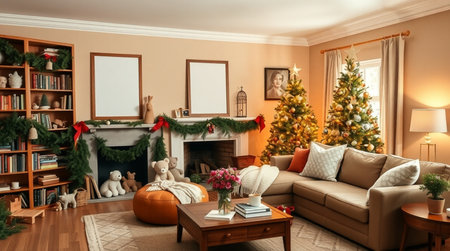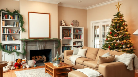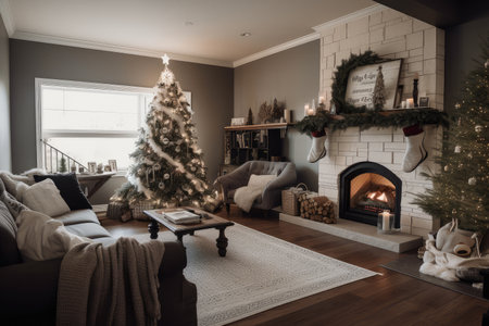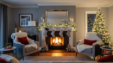 Cozy Christmas living room with fireplace and festive decorations