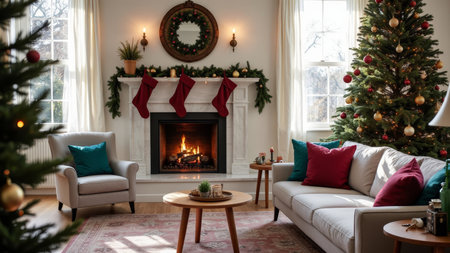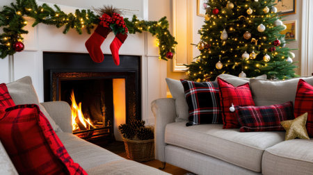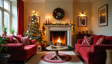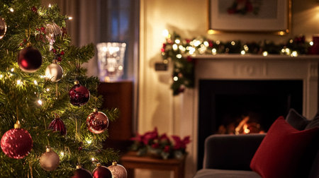A festive living room with a warm fireplace, holiday decorations, and a Christmas tree, creating a cozy atmosphere for Christmas celebrations.