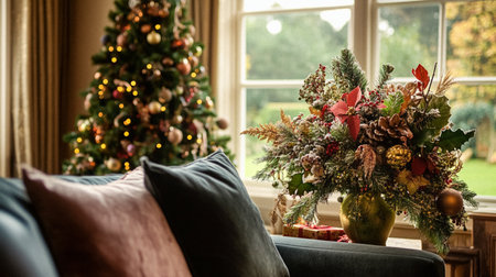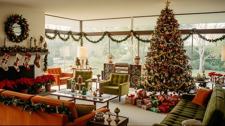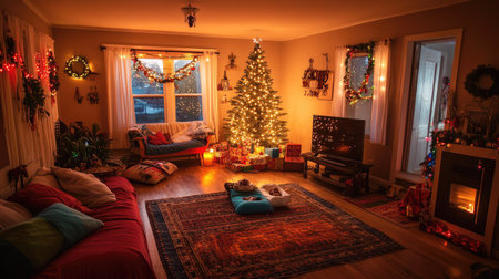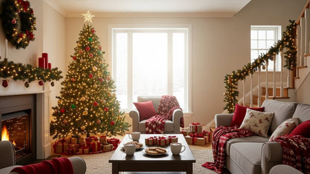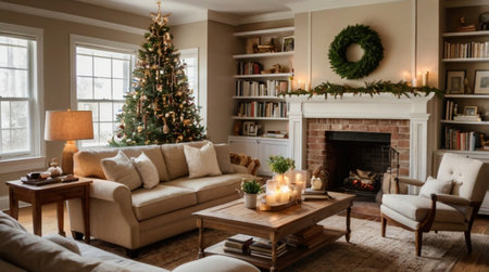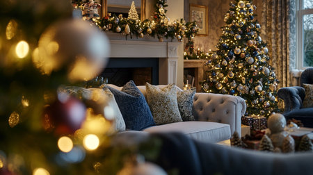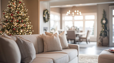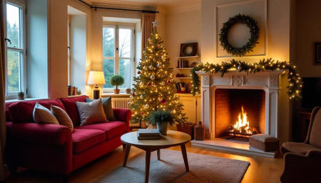 A cozy living room adorned with a beautifully decorated Christmas tree, warm lighting, and festive accents, perfect for creating joyful holiday memories.