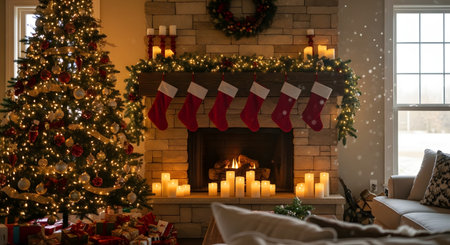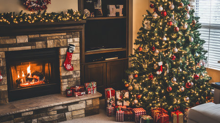 Cozy living room with a decorated Christmas tree next to a stone fireplace, gifts under the tree, and stockings hanging from the mantel. Warm, festive lighting and holiday decor.