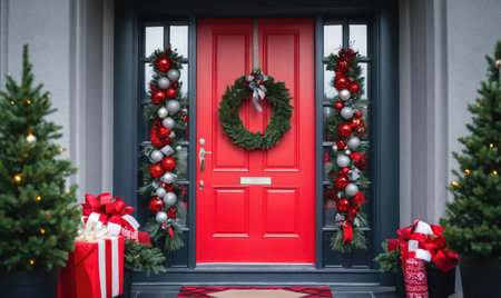A red door is decorated with a wreath and garlands for the holidays, flanked by small Christmas trees