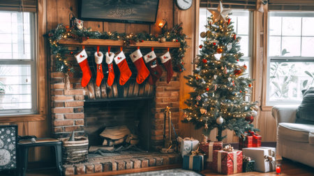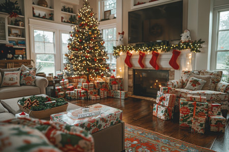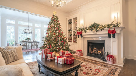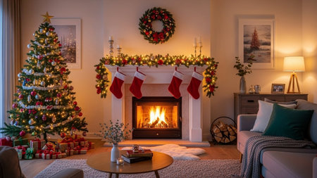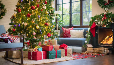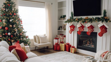A warm and inviting Christmas living room scene featuring a beautifully decorated tree, stockings hanging by the fireplace, and colorful wrapped gifts.