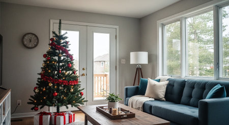 Interior of a living room decorated for christmas with a Christmas tree