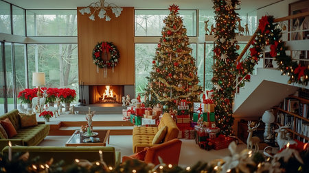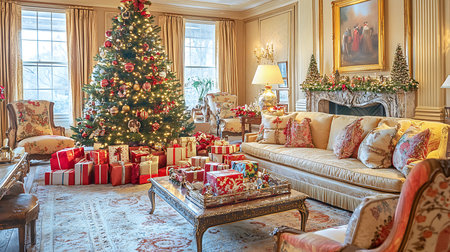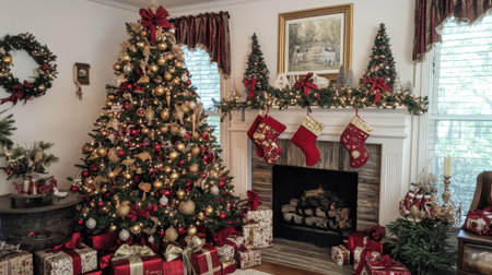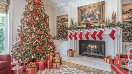 Christmas tree with elegant red and gold decorations, presents wrapped in coordinating colors, and a cozy fireplace with stockings hanging, creating a heartwarming holiday scene.