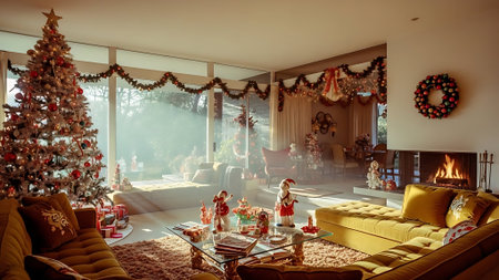 A cozy living room decorated for the holidays, featuring a beautifully lit Christmas tree, a fireplace adorned with garlands, and a coffee table with fruits and gifts