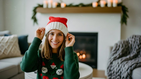 Beautiful young woman in a green sweater and a Santa Claus hat at home near the fireplace