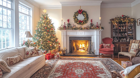 Experience the warmth of a cozy winter living room adorned with a beautifully decorated Christmas tree, inviting fireplace, and scenic view. Ideal for holiday inspiration.