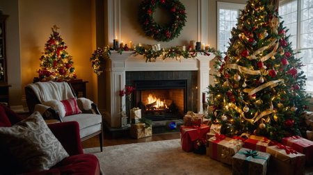 A beautifully decorated Christmas tree with red and gold ornaments, surrounded by festive gifts, and a fireplace with stockings hanging on the mantel.