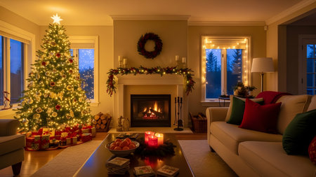 A festive living room scene at twilight, featuring a glowing Christmas tree and a roaring fire in the fireplace. The room is filled with warm light and holiday decorations, with a view of a winter evening through the large windows.